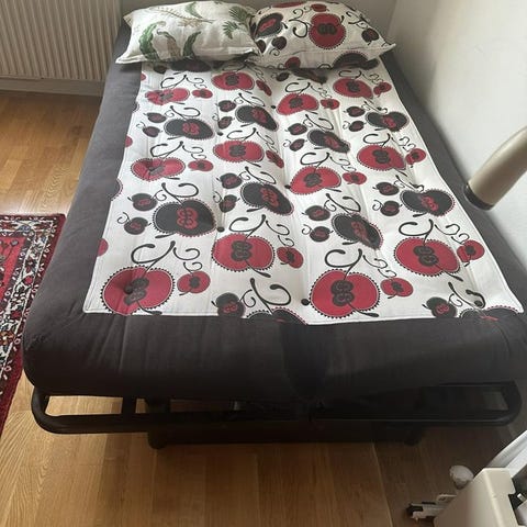Bäddsoffa/fåtölj. Klädseln har sett bättre dagar men en tvätt/omfärgning har den mycket mer att ge.