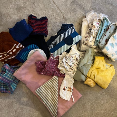Två tal dockor med kläder och tillbehör inklusive en rosa väska med nappflaska mm, och en rosa haklapp. Den större docka är ca 46-50 cm