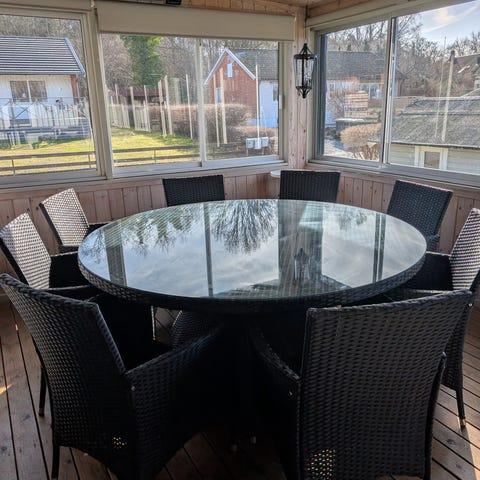 Trädgårdsbord med rund glasbordsskiva och svart metallram. Passar för utomhusbruk, lämpligt för balkong, terrass eller trädgård. Robust konstruktion med transparent glas och svart metallstativ.