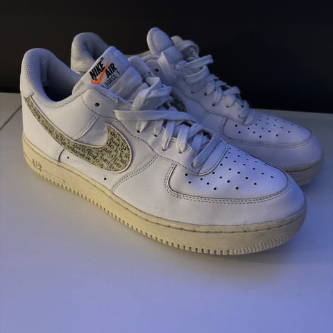 Nike Air Flight sneakers i storlek 45. Skorna är vita med svarta detaljer och har perforeringar för ventilation. Tillverkade i material som kombinerar hållbarhet och komfort. Passar för vardagligt bruk och sportaktiviteter.