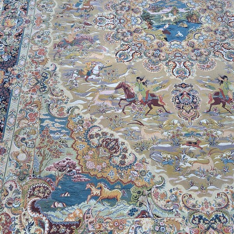 En otroligt vacker handknuten persisk matta med måtten 129x214 cm. Mattan är signerad och har ett jaktmotiv. Baserat på motivet och kvalitén så är mattan troligtvis från Täbriz eller Ghom.