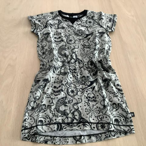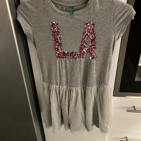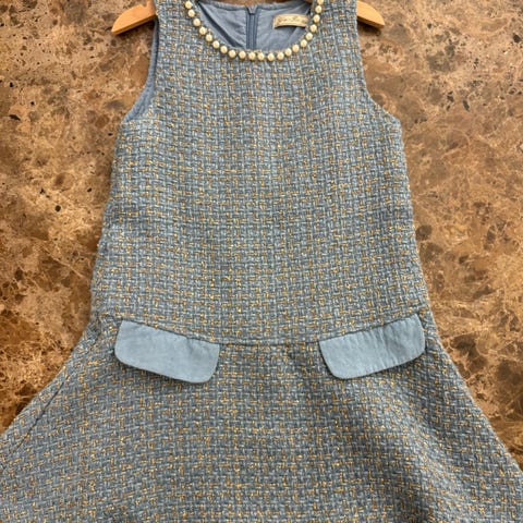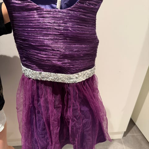 Blå klänning för flicka i storlek 122, stor storlek 130 men mer en 120. Klänningen har en ärmlös design med dekorationer runt halsringningen och en rosett i midjan. Materialet inkluderar ett lager av tyll som ger volym till kjolen. Använd endast en gång