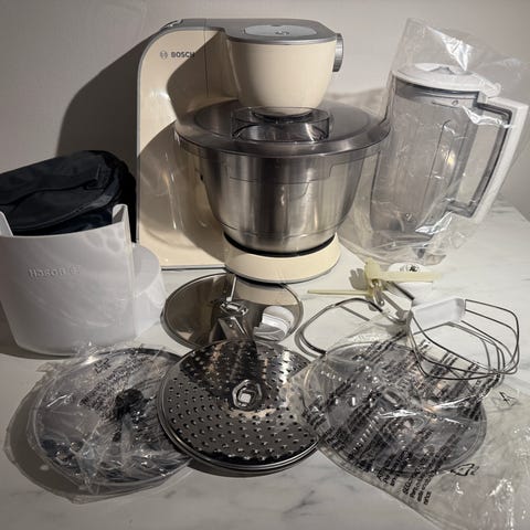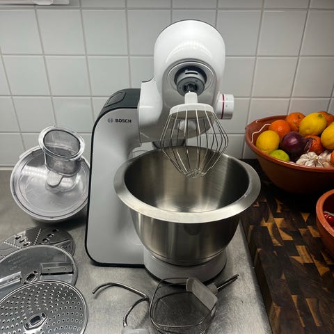 Bosch MUM4 köksmaskin med flera tillbehör inklusive visp, degkrok, rivskivor och rostfri bunke. Maskinen är svart och silverfärgad och avsedd för allmänt köksbruk.