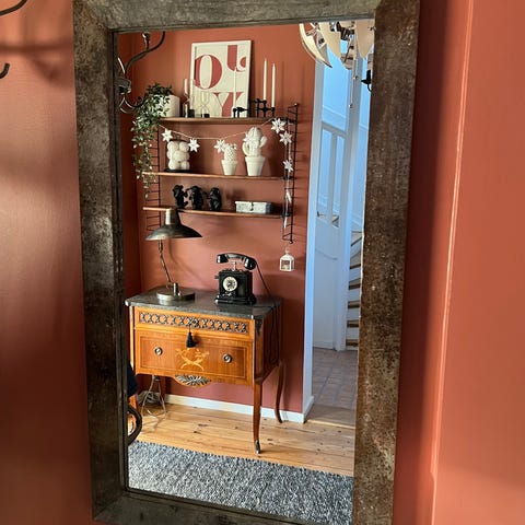 Stor vacker helkropps spegel i teak, 200 cm hög. Passar fint i hall och sovrum.