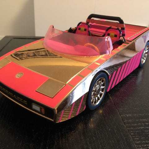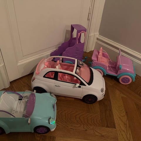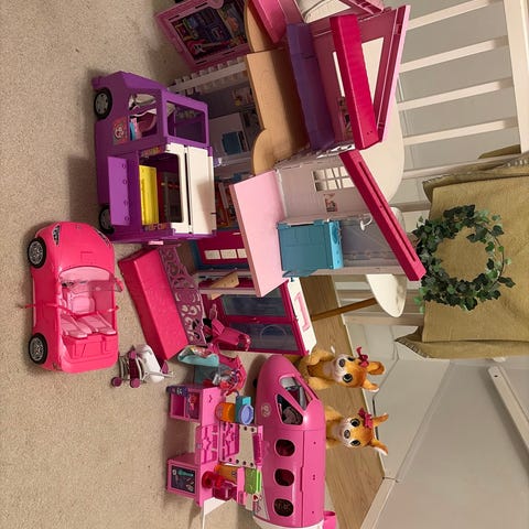 Set med olika Barbie-leksaker inklusive en rosa leksaksbil, två skåp i vitt och lila, en vit badkar, en tvättmaskin och torktumlare i vitt och lila, samt ett bord med två stolar i träfärg med gula sitsar. Passar för barns lek och inredning av dockhus.