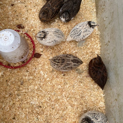 Blandade färger av japanska jumbovaktlar. Fåglarna är av olika nyanser och storlekar. De hålls inomhus på ströbädd .