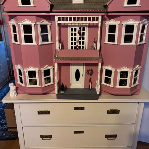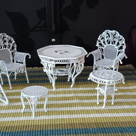 Dockskåpsmöbler i trä inklusive säng, skåp, bord, stolar och andra möbler. Möblerna är målade med dekorativa mönster och är avsedda för barnleksaker.Inköpt på 50 talet på