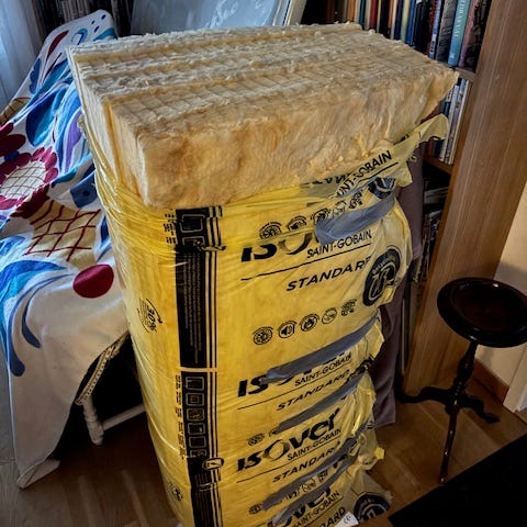 Isoleringsskiva tillverkad av mineralull, använd för värmeisolering och ljudisolering i byggnader. Skivan är avsedd för installation i väggar, tak eller golv för att förbättra energieffektivitet och ljudkomfort.