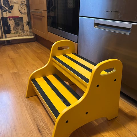 IKEA Barnpall i vit plast, avsedd för barn. Stegpallen har en stabil konstruktion med hålmönster på ytan för att förhindra halkning. Passar för användning i hemmet för att nå högre platser på ett säkert sätt.