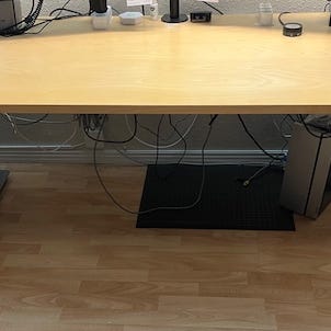 Paketpris på ett höj- och sänkbart skrivbord på el, en datorstol, 2 skärmar från Philips och en rullhurts. Allting fungerar som det ska!