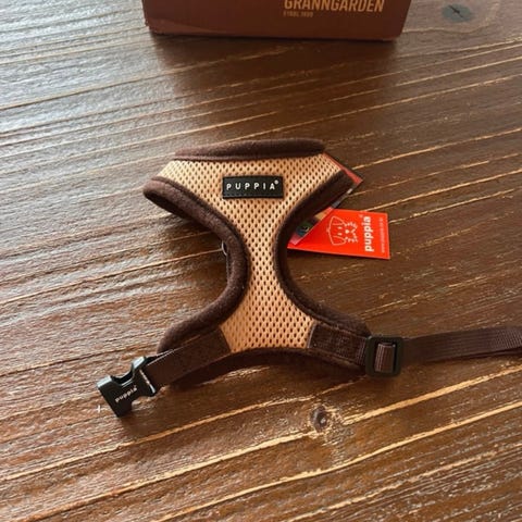 Puppia sele i röd och svart färg med två öppningar för frambenen och justerbara spännen. Tillverkad i andningsbart material för komfort.