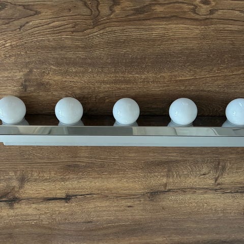 Vågglampa kromfärgad metall, vit veckad tygskärm 15 cm i diameter längst ner och 15 cm hög.