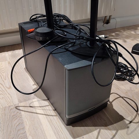 I gott skick och fullt fungerande. Ger klart och kraftfullt ljud, passar bra till dator för musik, film och vardagsbruk. Levereras med kablar och kontrollenhet.