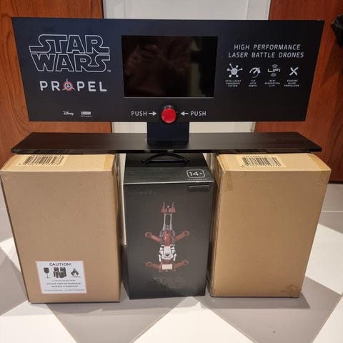 Hasbro Star Wars Propel radiostyrd flygplan med fjärrkontroll. Modellen är en rymdskeppsflygplan från Star Wars-serien. Produkten levereras i originalförpackning och är avsedd för användning som leksak eller samlarobjekt.