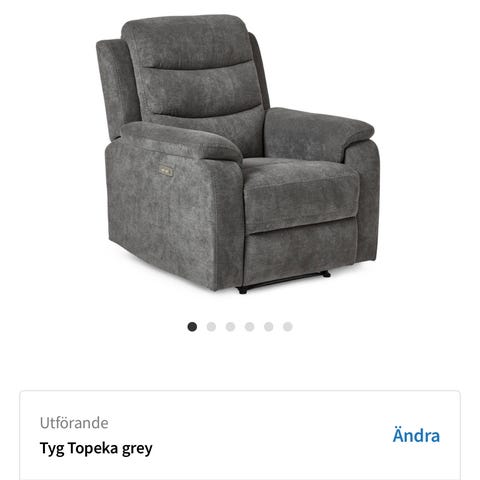 Mio fåtölj Erik med fotpall i grått tyg. Fåtöljen har hög rygg och är klädd i ett grått material.