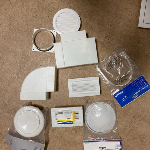 Rördelar i metall av okänt märke. Produkten består av flera delar av metallrör och kopplingar. Används för installation eller reparation av ventilations- eller avloppssystem.
