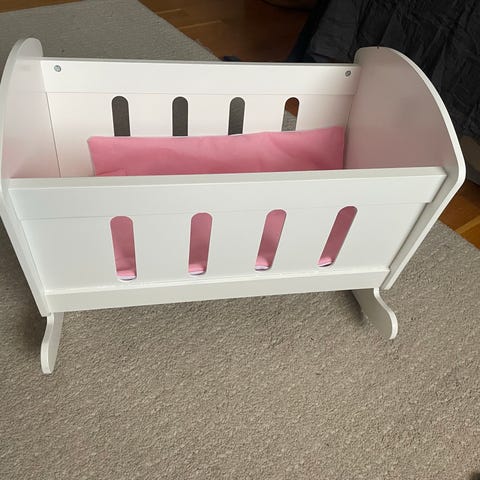 Säljer en dockvagga med måtten 60x33cm med måttsydd madrass, tillverkad på Kriminalvårdsanstalten Skenäs.