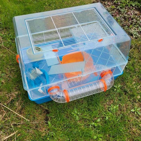 Medföljer div tillbehör som springhjul,sputnik, skålar,vattenflaskor om det önskas. Storlek 95x57x50. Skickas ej . Perfekt för tex råtta eller guldhamster.