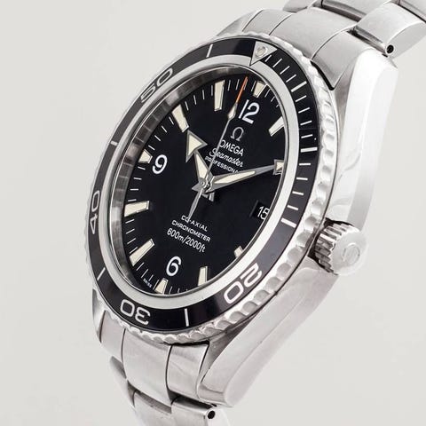 En begagnad Omega Seamaster Planet Ocean, samma modell som burits av James Bond. Med sin robusta boett, länk i stål, lysande markeringar och en vattentålighet på 600 meter är klockan en perfekt följeslagare på dykäventyr.