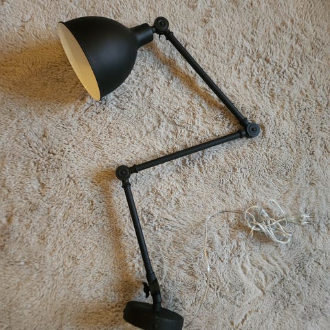 Säljer den här superfina IKEA-lampan från 1989 med klara färger och tydliga Bauhaus/Memphis-gruppen-vibbar! Vridbar så du kan välja om den ska lysa uppåt eller neråt. Raster som skyddar glödlampan. Lampan tänds med kontakt på den vita sladden.