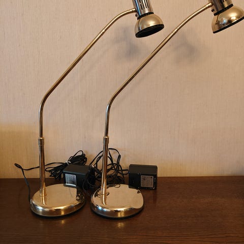 Två bordslampor med silver fot (skärmarna något slitna annars i fint skick). Två för 480:-