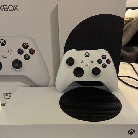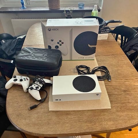 Xbox series s, två handkontroller och en laddare