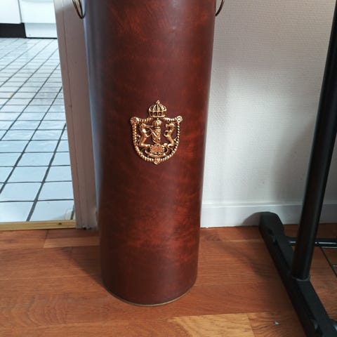 Ett snyggt äldre paraplyställ i hög kvalitet tillverkad i järn och förmodligen teak. I fint skick trots sin ålder, men lite skav och tecken på användning förekommer givetvis. Ca 50 cm hög och som mest ca 30 cm i diameter.