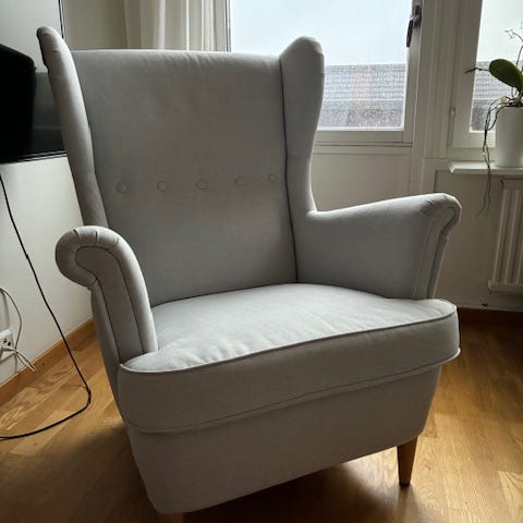 IKEA fåtölj med tillhörande fotpall i grått tyg. Fåtöljen har hög rygg och armstöd, samt träben. Passar för vardagsrum eller läshörna.