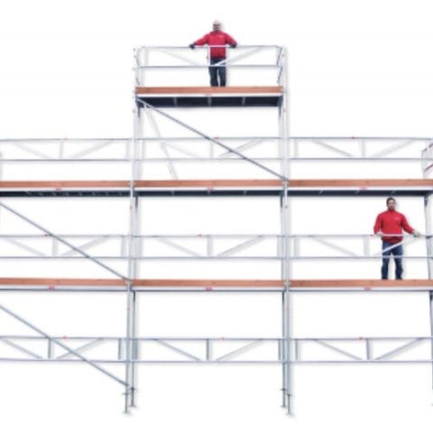 Nio gavlar i aluminium 2000mm höga. Sex tvärslåar och fyra snedsträvor i galvat stål.
