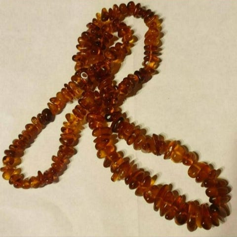 Bärnstens halsband, i olika färger De stora gula bärnstenarna 3 cm, 6 st, Hela halsbandet 33 cm långt med dubbla rader av små bruna stenar. Tillverkat av smyckedisignern Ulla Hallberg.