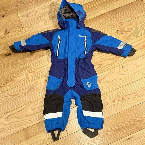 Blå/svart Didriksson overall strl 100 i mycket gott skick (inga skavanker alls). Är varianten som kan förlängas vilket är gjort idag så skulle tippa på att den är väl nånstans mellan strl 100/110 just nu.
