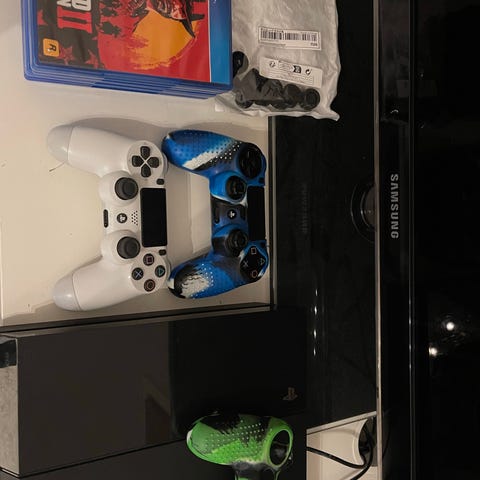 Sony Playstation 4 spelkonsol med två trådbundna handkontroller. Konsolen har HDMI- och USB-portar för anslutning till TV och andra enheter. Kompatibel med Playstation 4-spel, FIFA 15, 16, 17 och 18 ingår. Svart färg. Lite repor men inget jättesynligt, fungerar bra.