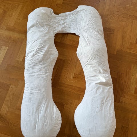 Gravidkudde i rosa färg, formad för stöd under graviditet. Tillverkad i mjukt material för komfort. Köpt i September
