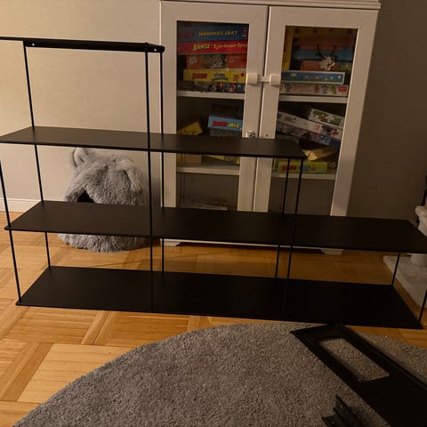 Hylla String (obs, ej pocketmodellen, utan större). Höjd 75 cm, djup 30 cm bredd 79 cm. Vita gavlar med svarta hyllplan.