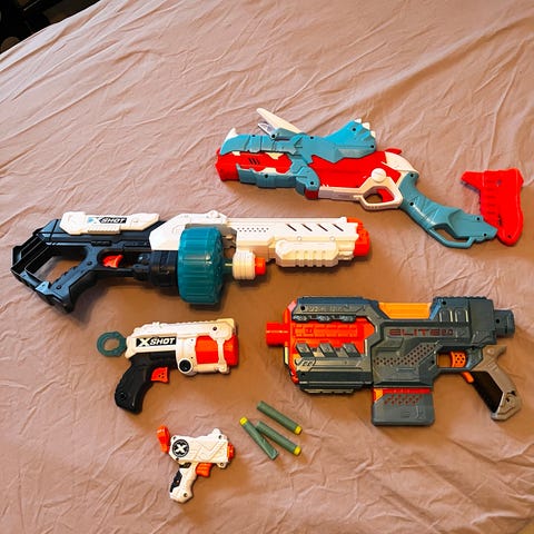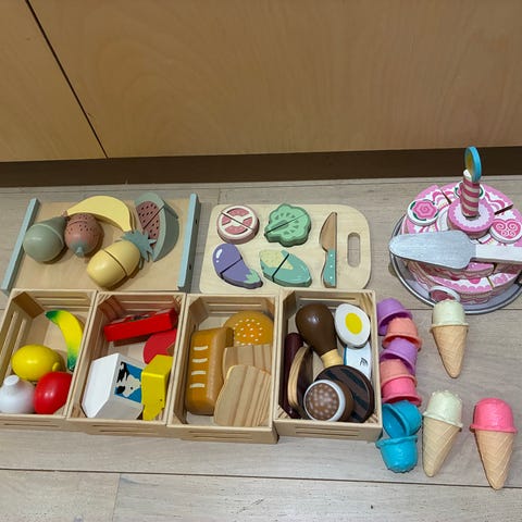 Barnleksaker i trä och plast med olika mat- och köksrelaterade tillbehör. Leksakerna inkluderar bland annat frukt, grönsaker, bröd, köksredskap och en leksakskassa. Te-set från Green toys. Färgglada och utformade för barnlek.