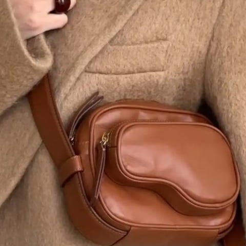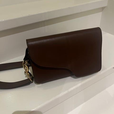 Väskan är tillverkad i läder. Den har en enkel och stilren design med en magnetisk stängning och två axelremmar.