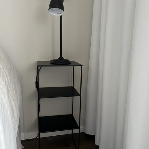 Vita, vägghängda sängbord inköpta på Mio för ett par år sedan. Då låg priset på 900 kr/hylla.