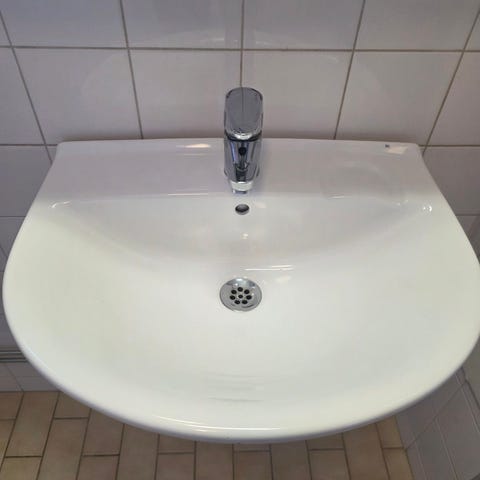 Handfat i vit keramik och blandare från märket Gustavsberg.