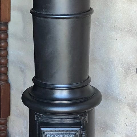 Vermont Casting Intrepid gjutjärnskamin. Osäker på funktion och ålder.