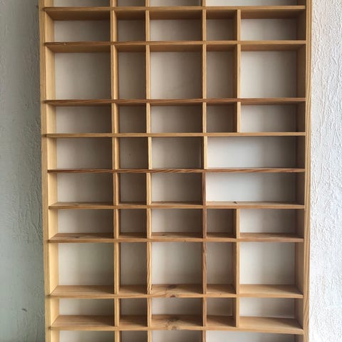 Prydnadshylla med många olika hyllplan med olika storlekar.