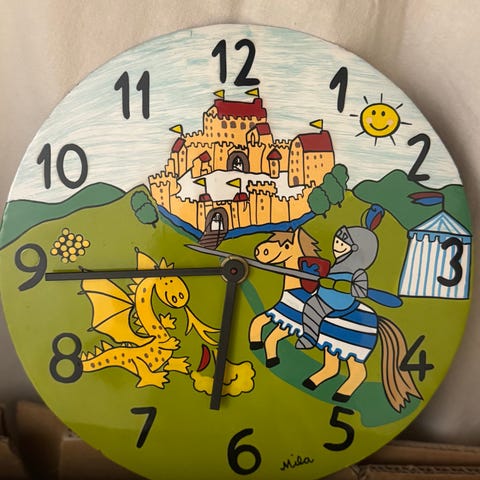 Väggklocka med hästbild, 30cm diameter. Lätt material (plywood), nyskick och fullt fungerande. Batterie följer inte med.