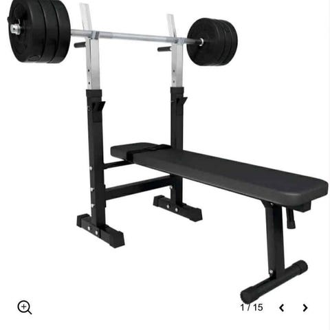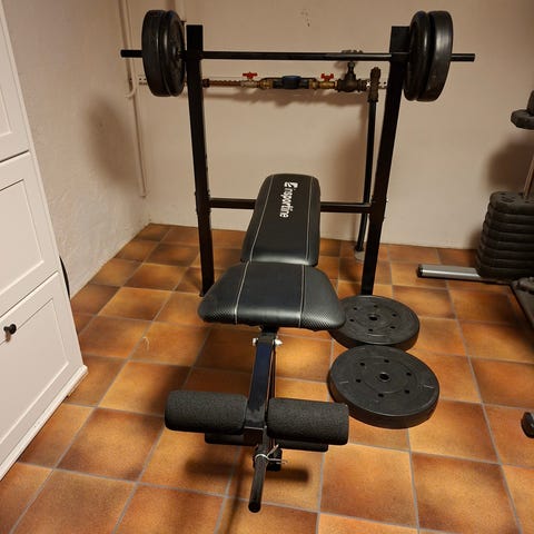 Träningsbänk som kan ändra i lutning, inkluderar även en hamstring curl och en benspark. Bänkpressen kommer med 2x10kg 4x5kg 2x2,5kg 2x1,25. Skivstången väger 3kg och totalt blir det 50kg. Perfekt för dig som vill börja i gymmet. Mått: längd 1,61•66•112cm
