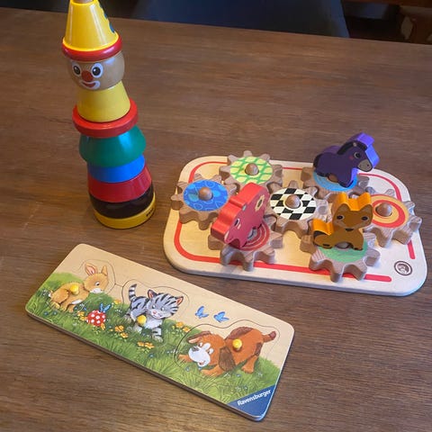BRIO Barnleksaker Set med olika färgglada leksaker inklusive brandbil, tågvagn, och aktivitetsleksak med ratt. Leksakerna är tillverkade i plast och trä och är avsedda för barn.