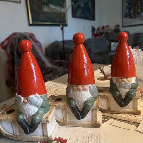 Keramik juldekorationer bestående av en tomtefigur, ett hus, en häst och ett staket. Dekorationerna är små och detaljrika, lämpliga för att skapa en vinter- eller julstämning i hemmet.