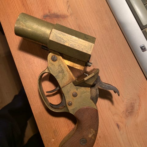 Dubbelpipig slaglåspistol. Påminner mkt om en sk "Smålänning"