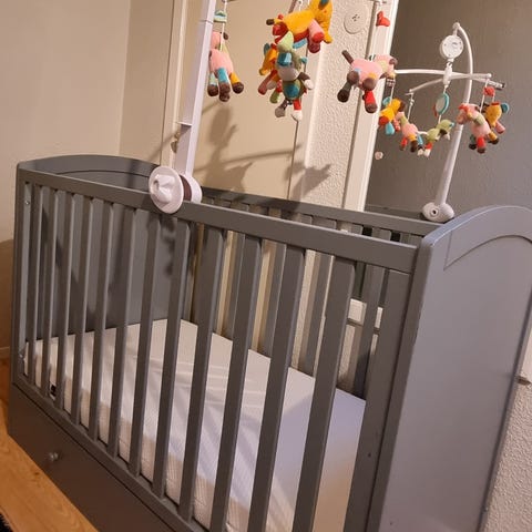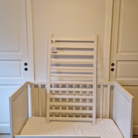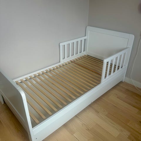 Spjälsäng i trä med vit finish, utrustad med en förvaringslåda under sängen. Passar för småbarn och erbjuder en säker sovplats med praktisk förvaring. Madrass medföljer