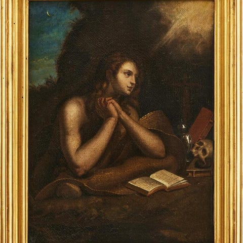 Antik större oljemålning på duk. Ca. 80 x 64 cm. Otydligt signerad, sannolikt kvinnlig konstnär - (detta är ett motiv som gestaltats av flera kända kvinnliga konstnärer.) Krackeleringar, ålders relaterat slitage, duklagningar. Transport till centrala Sthlm. möjlig efter överenskommelse. + 300kr.