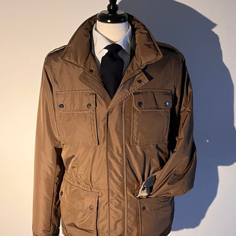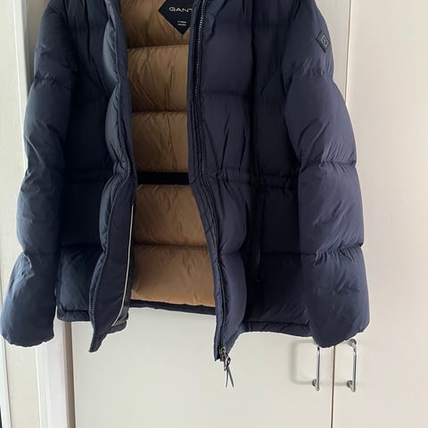 Mellanlång svart herrdunjacka strl large (L). Fyra innerfickor, fyra ytterfickor (varsin svart knapp på två, annars blixtlås), avtagbar kapuschong (reglerbar), blixtlås och tryckknappar (silver) fram. Varm med 90% dun. Ytterskal bomull och polyester. Grått foder. Nyskick