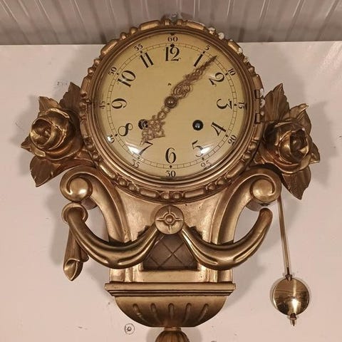 Säljer min vackra förgyllda väggpendyl, Levins Westerstrand från 40-talet. Välskött. Mått ca 58 x 28 cm.