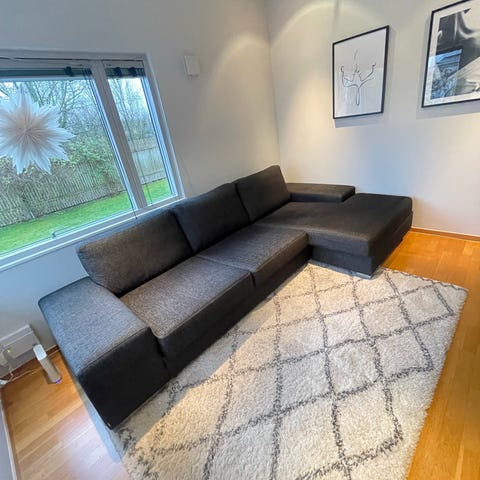 Stor soffa med två divaner i bra begagnat skick, stomme/armstöd är mörkbrunt och sits/kuddar är antracit mörkgrå.